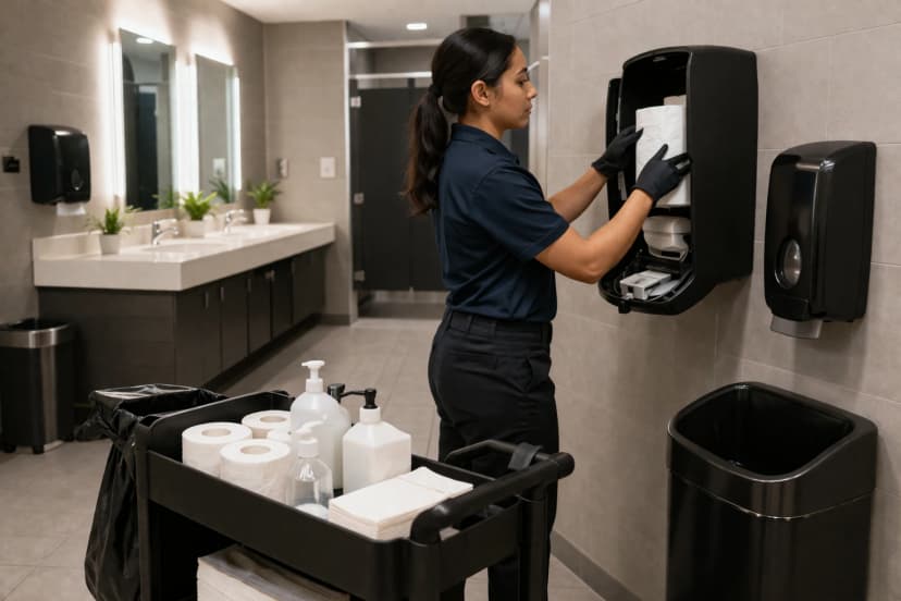 Paper towels, soap, liners, and restroom consumables restocked as part of your service plan — tracked, replenished, and never running out.